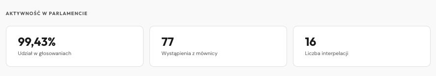 - Aktywność w Parlamencie (udział w głosowaniach, wystąpienia z mównicy, liczba interpelacji),