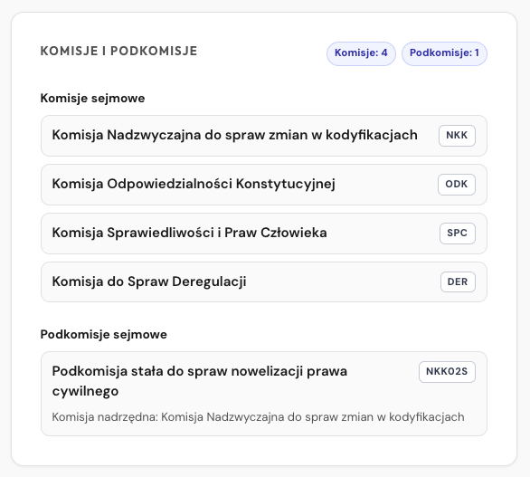 Komisje i podkomisje to w teroii serce procesu legislacyjnego. To właśnie tutaj wykuwa się prawo, które później jest głosowane. W moim projekcie znajdziesz informacje o tym, w jakiej komisji i podkomisji jest poseł, ale to tylko sucha informacja, która może Ci pomóc w identyfikacji zainteresowań danego polityka. Czego nie zobaczymy?